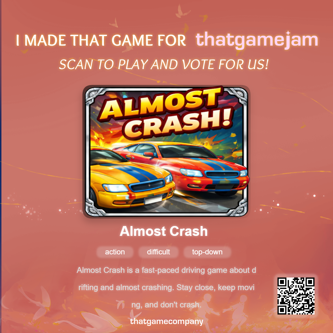 Almost Crash is a fast-paced arcade driving game about drifting through city streets and surviving near-misses. Stay close, keep moving, and don’t crash.